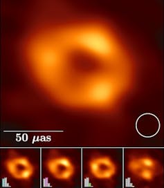 En relación a las manchas brillantes en la imagen de Sagitario A*, estas se deben a un aumento aparente en la emisión cuando la radiación apunta directamente hacia nosotros (el conocido como efecto Doppler para ondas electromagnéticas).