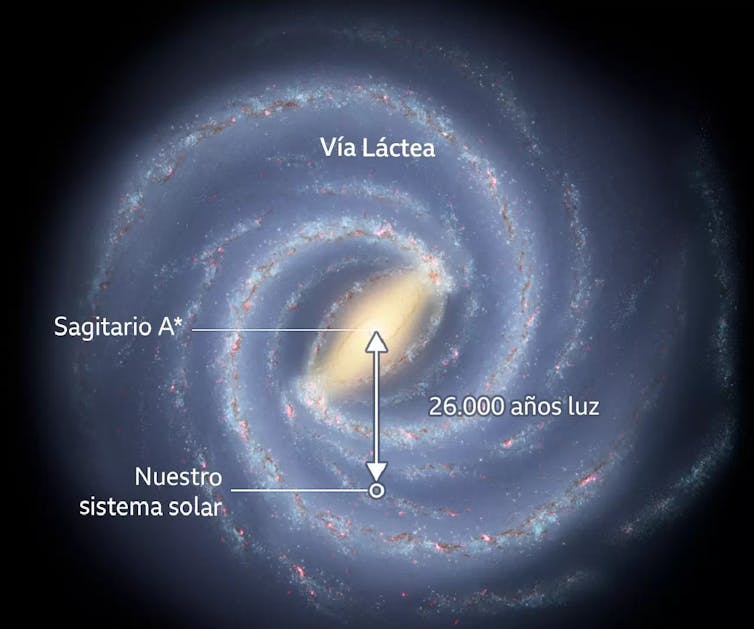Se trata de un monstruo con una masa equivalente a cuatro millones de soles situado a 26 000 años luz de nuestro planeta. Con un diámetro 17 veces mayor que el de nuestro Sol es, sin embargo, mil veces menor que el agujero negro supermasivo en la galaxia M87, el primero en ser fotografiado en 2019.